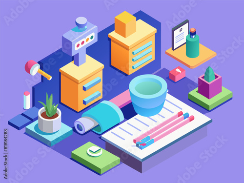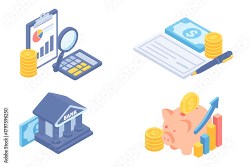 Bank rates and services vector illustration. Finance growth, budget and percent of profit from investment concept. Banking financial system, deposit income calculation 3d isometric design