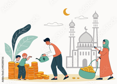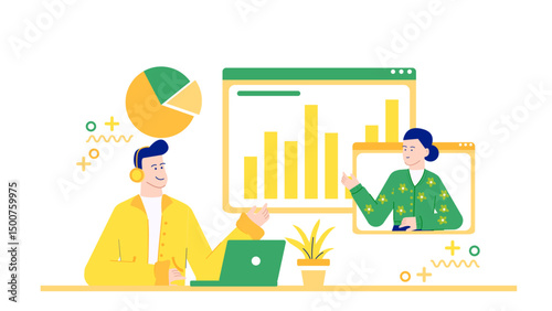 Bank building, man with megaphone attracting financial resources, happy woman balancing on one leg on dollar coin, vector flat illustration. Deposits promotion, banking business, bank services.