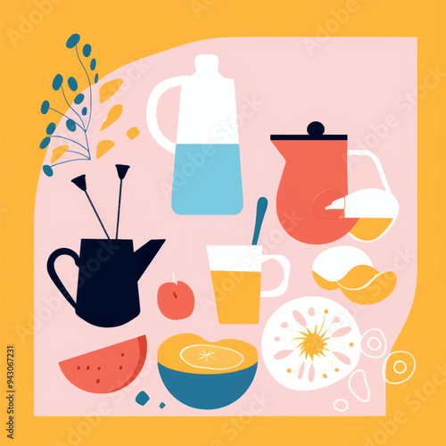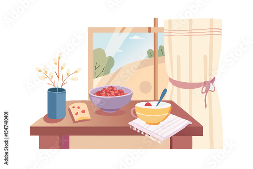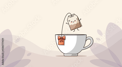 Barista tiny male and female characters making giant cup of matcha green tea, flat vector illustration. Tea room, teahouse. Healthy and organic herbal beverage, traditional japanese ceremony.