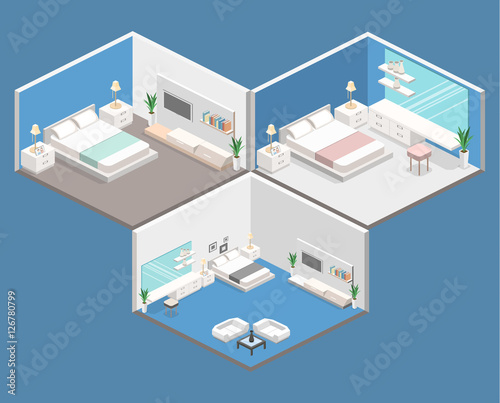 Bathroom interior constructor, vector flat isolated illustration. Isometric cutaway bathrooms and furniture bathtub, shower stall, mirror, toilet, washbasin, towel rack and bathroom cabinet.