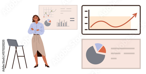 Bathroom interior and girl taking shower, vector flat illustration. Modern shower stall, washbasin, mirror and lights. Woman bathroom interior.