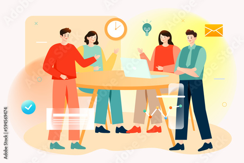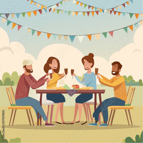 Bbq party with friends, flat vector illustration. People cooking meat, sausages on grill, drinking beer and having fun. Outdoor barbecue picnic, summer leisure activity.