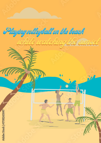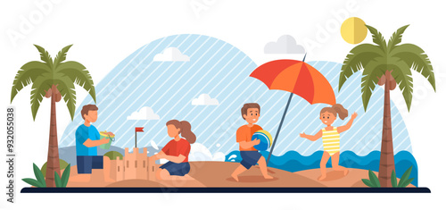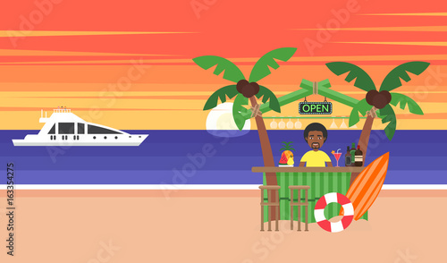 Beach party with dj playing disco music, flat vector illustration. Happy man and woman cartoon characters dancing to music on beach and having fun. Summer travel, tropical vacation, friendship.
