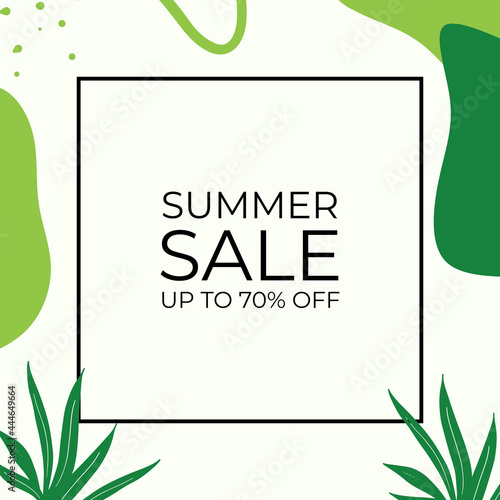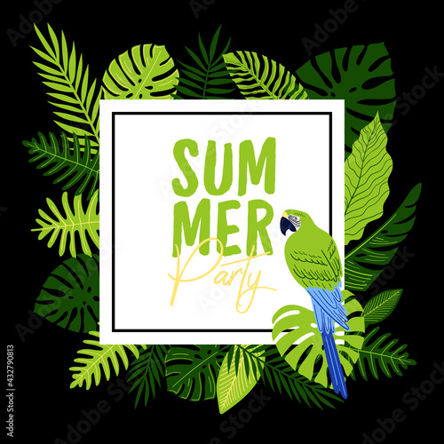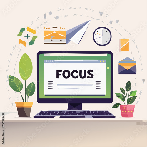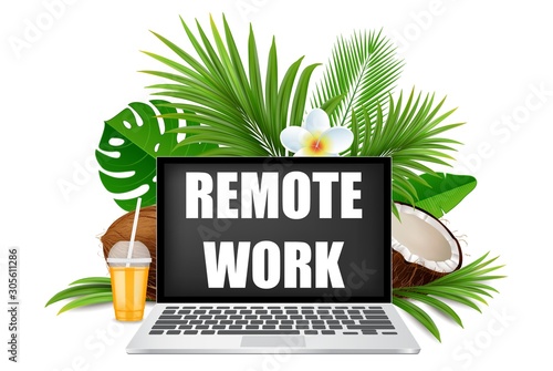 Beach remote working place vector concept illustration. Freelance, distant work composition with laptop, glass of cocktail, tropical plants and coconuts.
