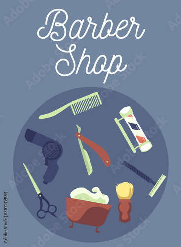 Beard care vector flat illustration. Hair shaving machine, mirror, comb, aftershave, straight razor, shaving brush with foam, scissors, shampoo. Barber supplies for beard grooming for website page etc