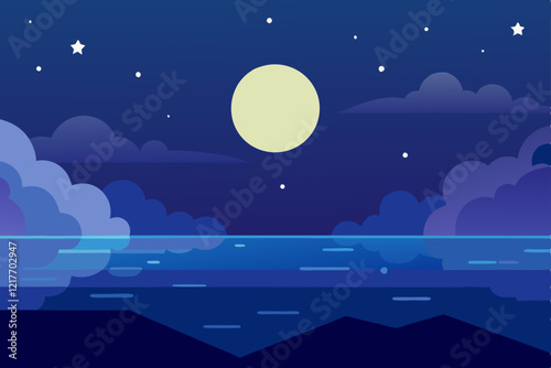 Lunar night, starry sky, moon glade on lake water, vector illustration. Full moonlight reflection on water in darkness. Beautiful romantic nature landscape.