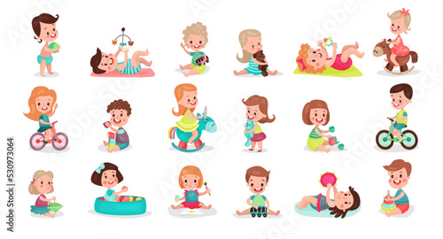 Beautiful princess in crown icon set. Vector illustration isolated on white background. Fairytail girl riding unicorn, holding cat, listening to music, eating ice cream, posing and having fun.