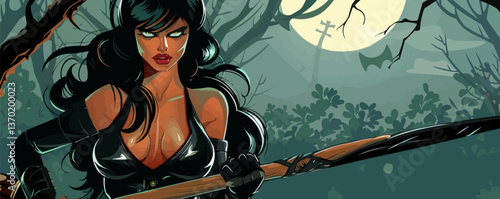 Beautiful woman sit on a bag in airport. Vector illustration in comic retro pop art style.