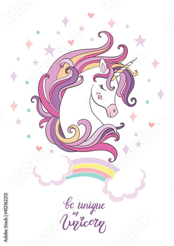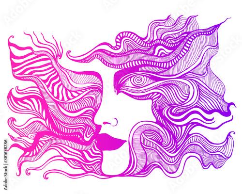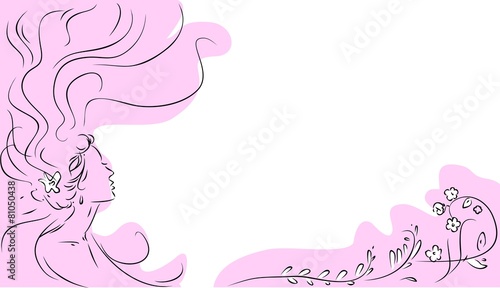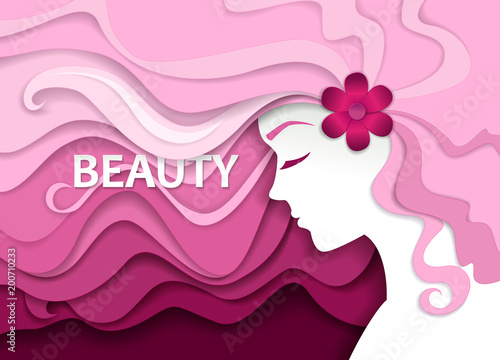 Beautiful girl with long wavy hair. Vector illustration in modern paper art style. Beauty and hair salon logo, business card design template.