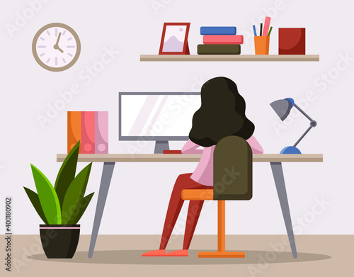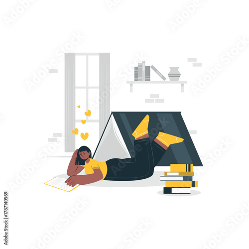 Bedroom interior and girl sleeping in bed by the window, vector flat illustration. Cozy woman bedroom with furniture and decoration, modern home interior.