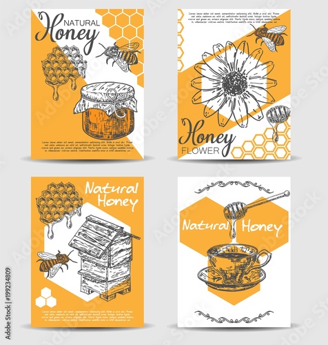 Bee natural honey vector hand drawn card template set. Honey product banner, poster, flyer collection illustration