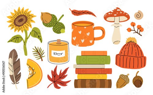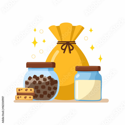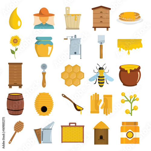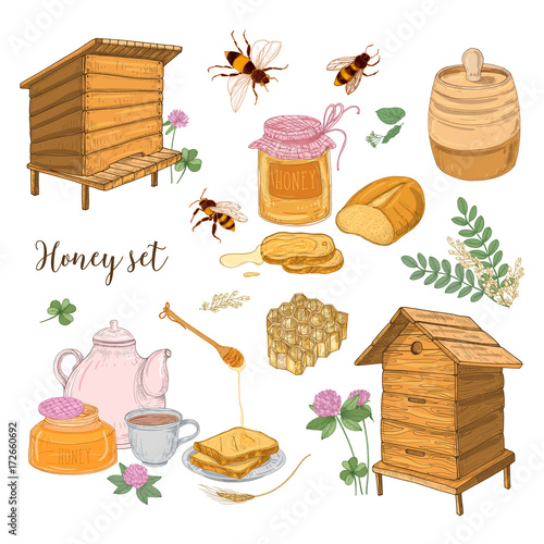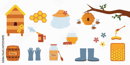 Beekeeping set, flat vector illustration. Beekeeper cartoon characters, beehive, bee, honeycombs, honey jar, dipper, barrel flowers. Healthy sweet syrup. Beekeeping farm. Honey bee farming business.