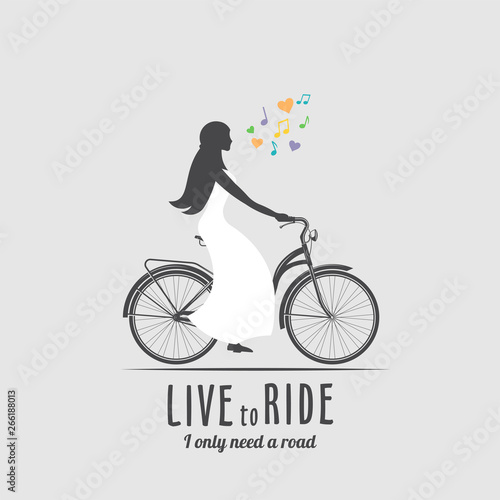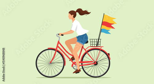 Bicycle holiday concept vector illustration in flat style. Young woman with purchases riding bicycle.