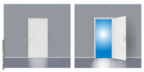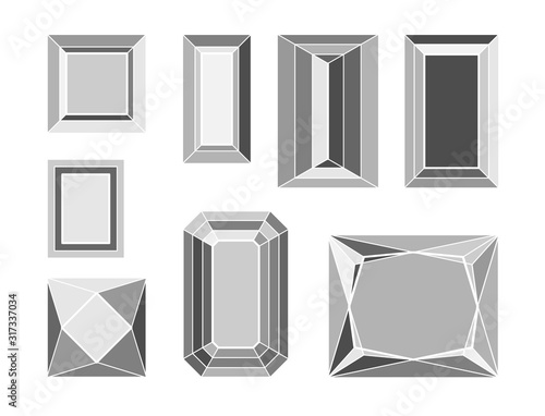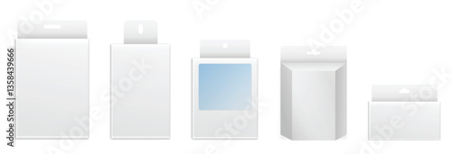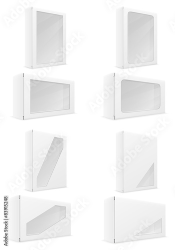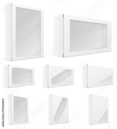 White cardboard package box with transparent plastic window blank 3d mockup vector design. Big paper pack template different shape isolated set