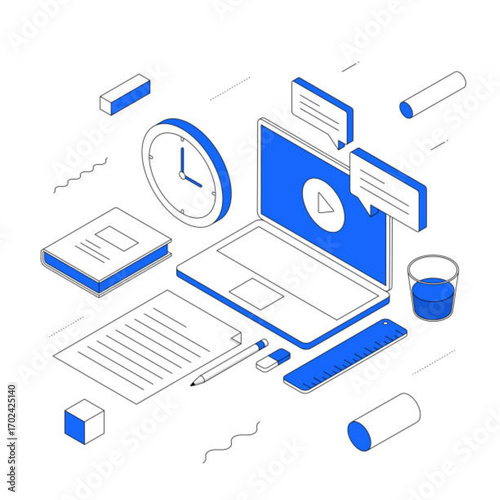 Bike online vector illustration. 3d isometric cycling helmet, glasses, bicycle wheel on laptop keyboard. Online shopping, bike service, e-commerce concept design elements isolated on white background.