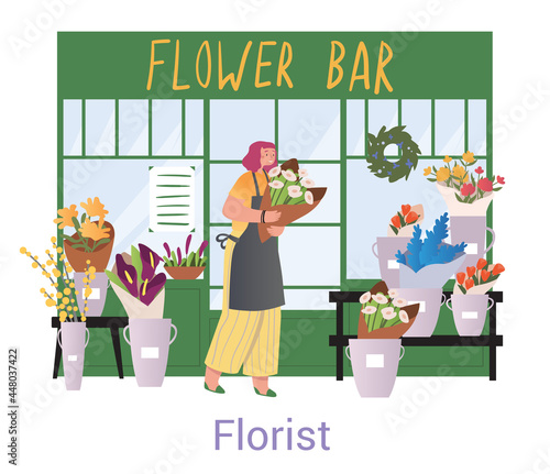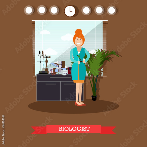 Vector illustration of scientist female holding plant. Biological lab interior with laboratory glassware and equipment. Biologist concept flat style design element.