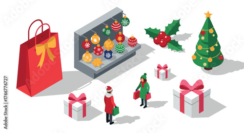 Birthday party celebration with gifts and cake, flat vector isometric illustration. Boy getting monopoly business game birthday present.