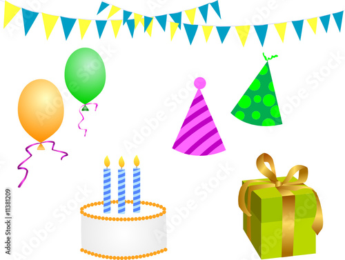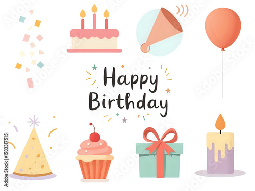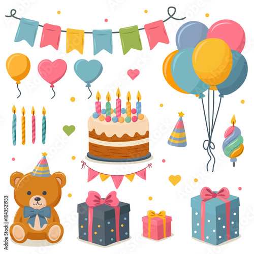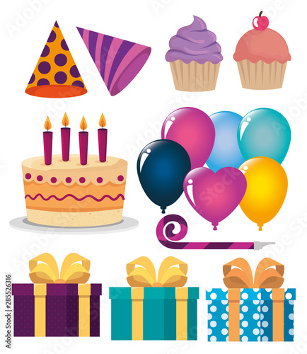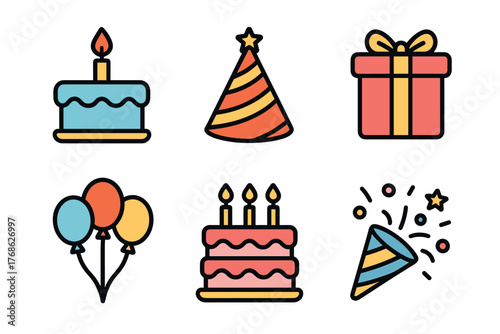 Birthday party icon vector isolated flat set. Greeting card, gift, hat, sweet cake with candles decoration, confetti, chocolate and balloons illustration