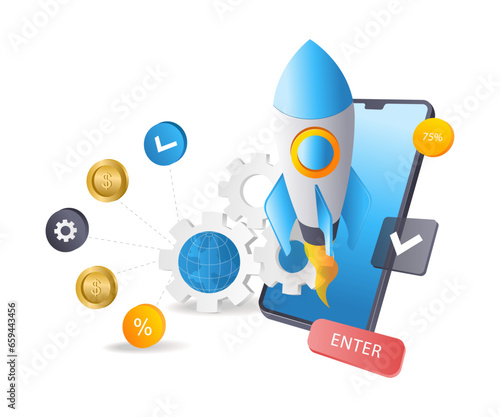 Bitcoin crypto currency trading rocket 3d vector illustration. Online graphic financial growth and economy, trade and sell launch concept. Spaceship, smartphone and candlestick design banner