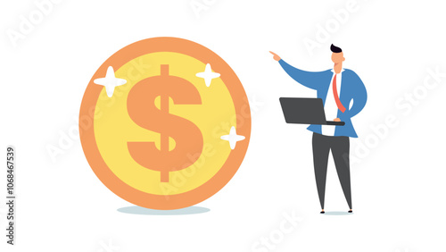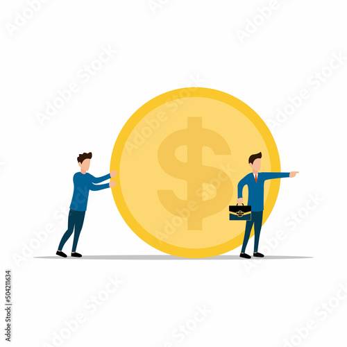 Bitcoin growth concept vector illustration. Businessmen pushing up golden coins with dollar, euro, yen, pound symbols, bitcoin is ahead of the other currencies.