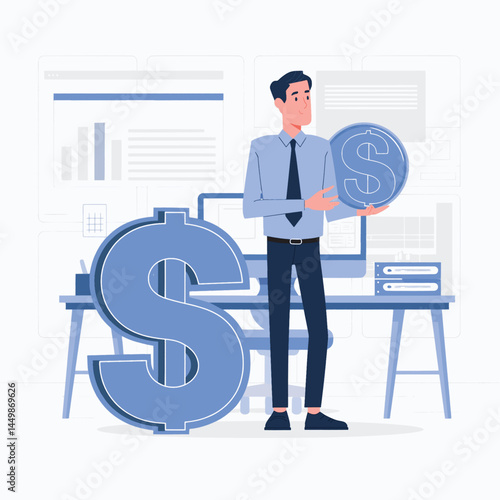Bitcoin growth concept vector illustration. Businessmen blowing balloon in shape of golden coin with bitcoin currency symbol, bitcoin growth graph.