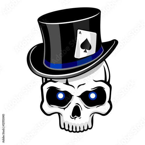 Black cylinder top hat vector. Halloween headdress with scary creepy death head bone decoration and red ribbon icon isolated on white background