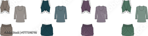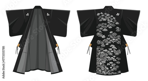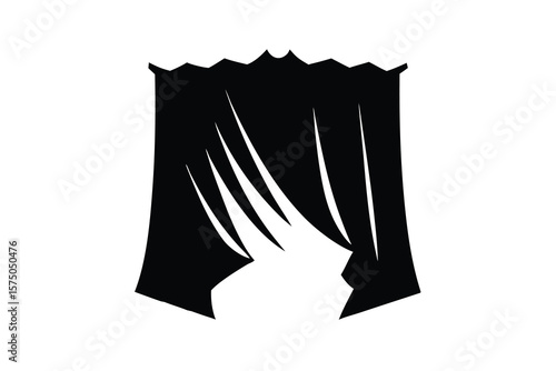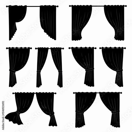 Black fluttering curtain set, vector illustration isolated on white background. Realistic lightweight curtains, window coverings for interior decoration.