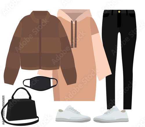 Black spa clothing mockup set, vector illustration isolated on white background. Terry towels, fluffy bathrobe and slippers. Realistic spa apparel and accessories.