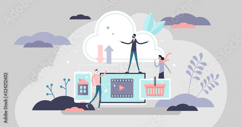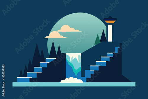 Blank drink water plastic bottle, paper cut mountains, forest trees, vector illustration. Clean drinking water ads template.