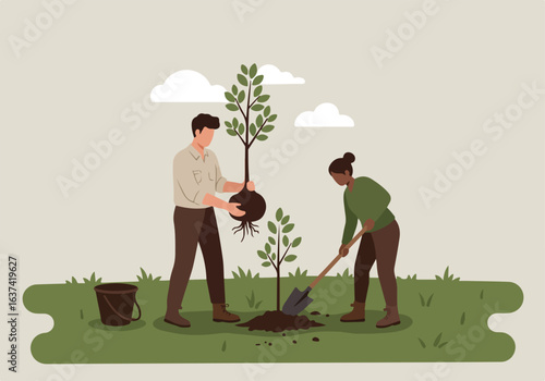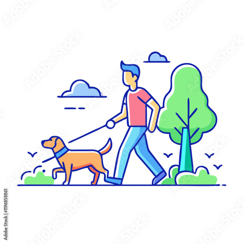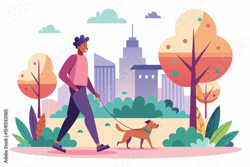 Blind woman walking with stick and guide dog in city park, flat vector illustration. Disabled girl with pet dog companion. Pets assistance for person with visual impairment.