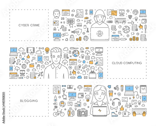 Blockchain technology advertising vector illustration. Blockchain for business ad concept. Thin line flat style design element for web banners and printed materials.