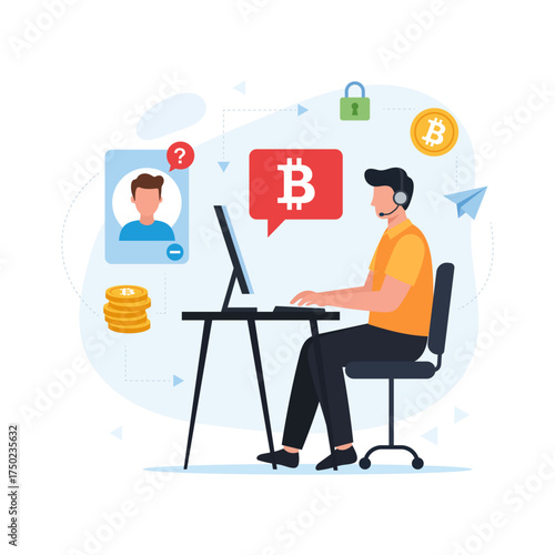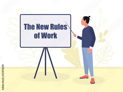 Vector illustration of businessman speaker giving presentation of what is blockchain technology using visual aids. Business conference meeting concept. Flat style design.