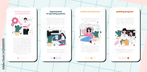Blogging review, Blog creation and Beauty blog mobile app onboarding screens. Menu banner vector template for website and application development. Vlogging, influence marketing, video blogging.