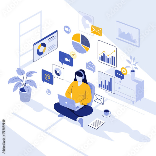 Vector illustration of young woman and astronaut from the Moon communicating via internet. Interplanetary internet, blue space communication technologies concept for web banner, website page etc.
