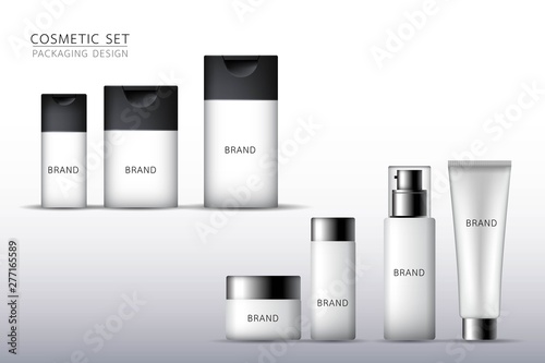 Body care cosmetics packaging vector mock up set. Realistic beauty and skin care products plastic containers bottle, tube, jar, stand up pouch bag for cream, shower gel lotion oil scrub salt for bath.