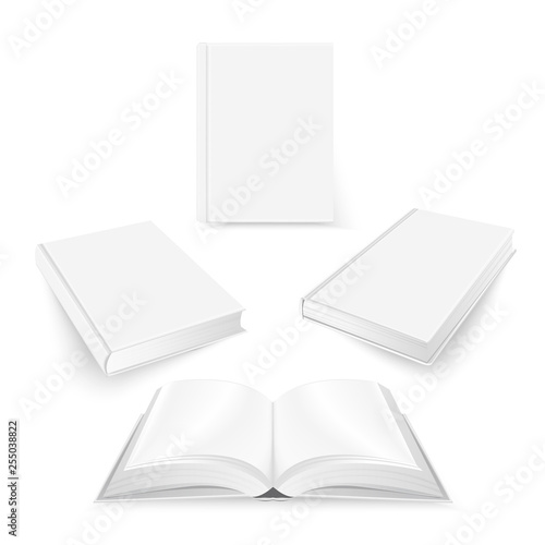 Realistic book mockup set, vector isolated illustration. White blank booklet, brochure, magazine cover. Hardcover, softcover or paperback book templates.
