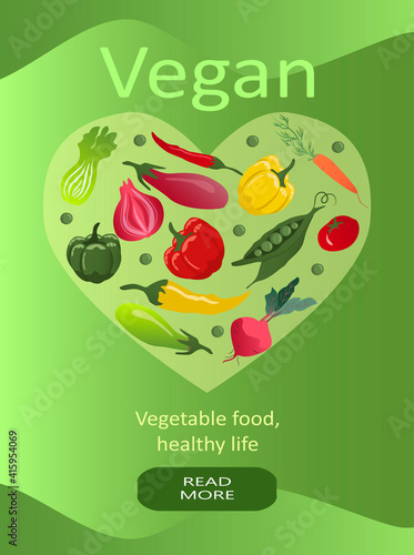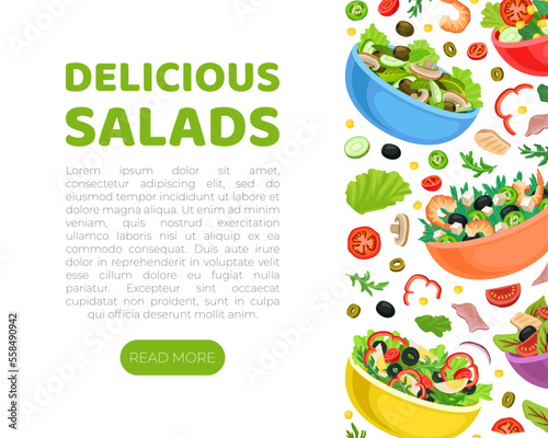 Bowl with delicious vegan salad, hand holding fork with broccoli, vector top view illustration in paper art style. Healthy diet, vegetarian meal. Healthy food poster, banner design template.