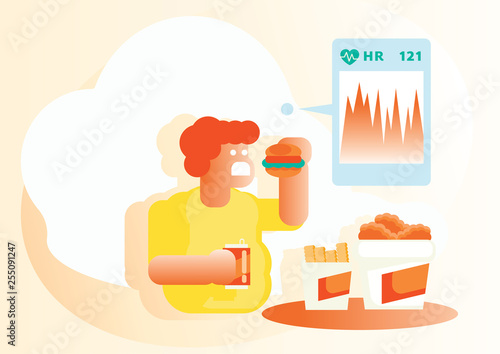 Boy looking at refrigerator with unhealthy junk fast food flat cartoon vector illustration. Little son feeling hungry and searching for food inside fridge