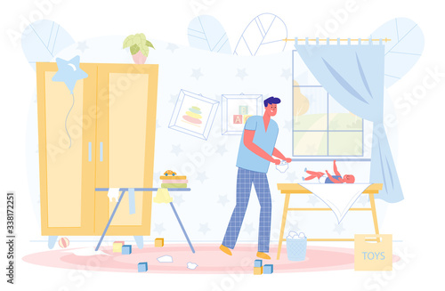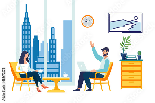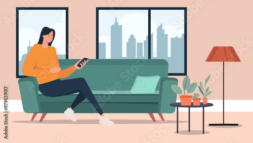 Vector illustration of young man with smartphone sitting on sofa in living room. Flat style design.