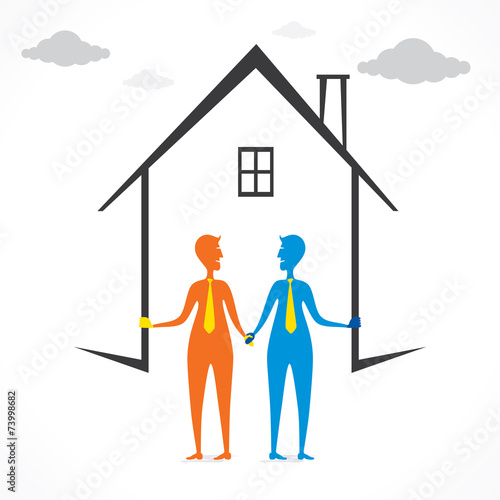 House building with business people silhouettes. Broker, realtor and customer handshake, vector illustration in paper art style. Business partners shaking hands. Real estate negotiations, good deal.