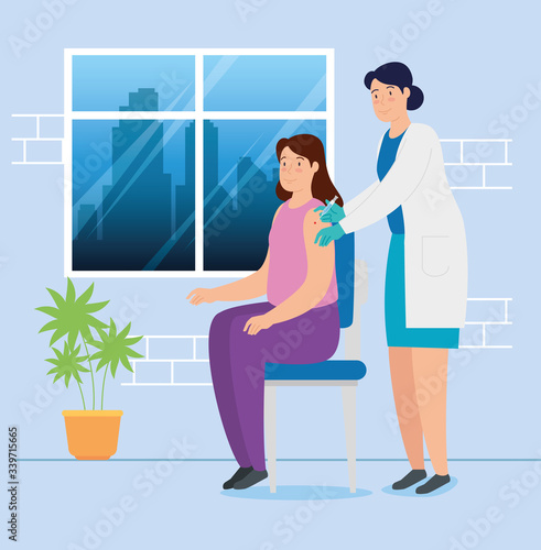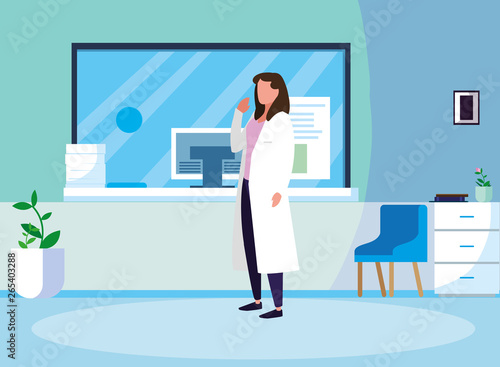 Young brunette woman trying on white dress in front of mirror in fashion boutique, flat vector illustration. Woman clothing store, beauty and fashion concept.