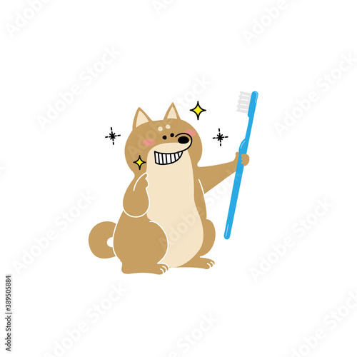 Brushing cartoon dog teeth with toothbrush vector. Animal pet dental care icon. Cute bulldog oral hygiene isolated on white background