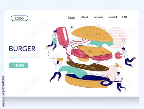 Burger vector website template, web page and landing page design for website and mobile site development. Micro characters chefs cooking big burger bun with meat patty, egg, tomatoes, lettuce, cheese.