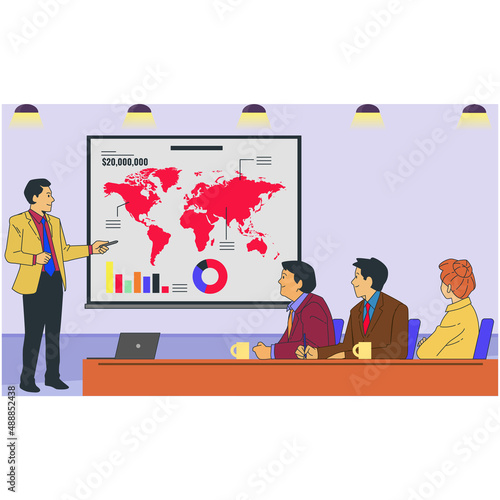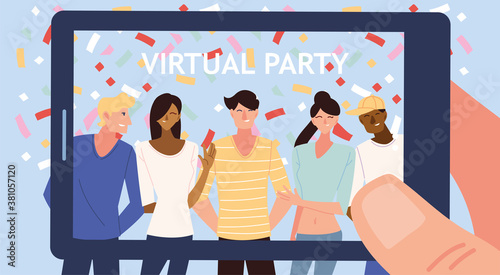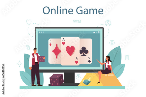 Vector illustration of big laptop with handshake on screen and tiny people characters signing contract. Business agreement, successful partnership, making a deal concept for web banner, website page.
