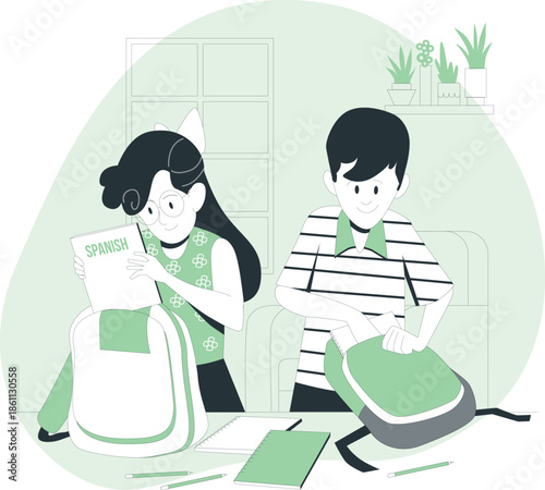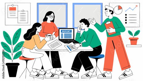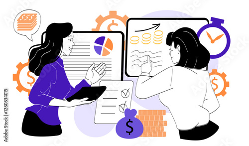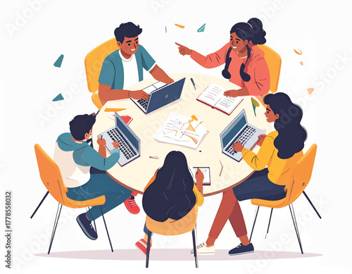 Business analysis and planning. Concept top view vector illustration. Business people sitting at a table. Office meeting, team work, project management, financial report and strategy, office desk.