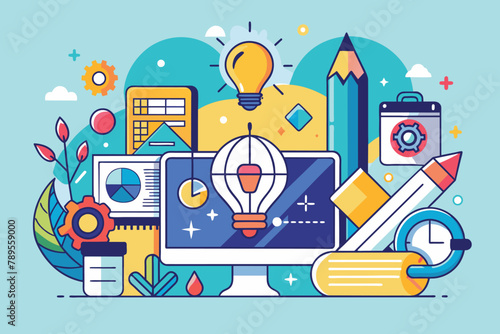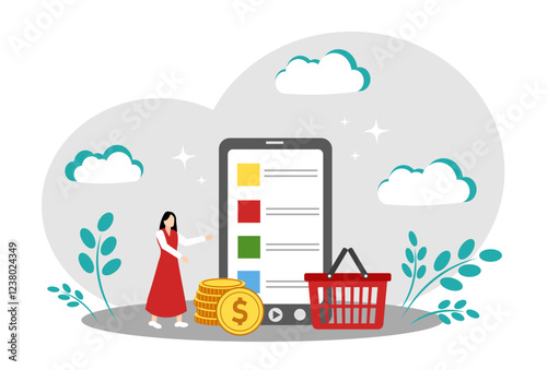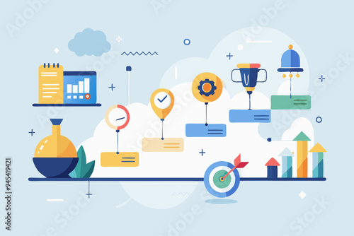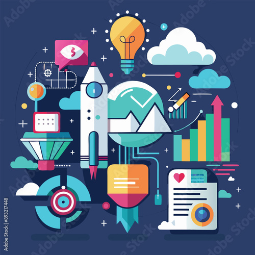 Business analyst vector flat illustration. Tablet with dashboard, target, calculator, lamp, award cup, clipboard with checklist, marks. Business analysis services concept for web banner, website page.