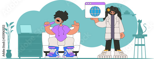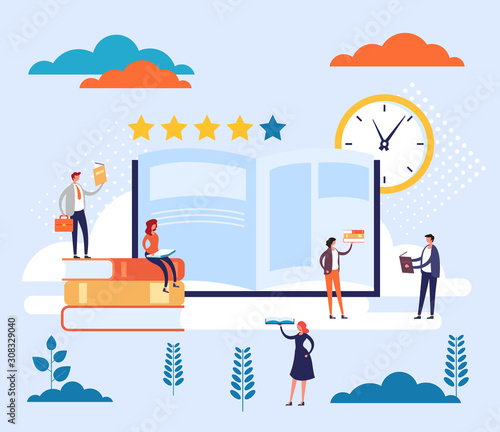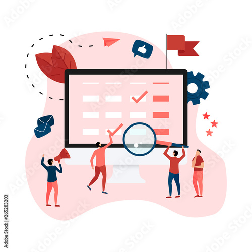 Business people analysts, micro characters interacting with charts on huge tablet screen, vector flat style design illustration. Business analytics, seo, data analysis process, analyst service.