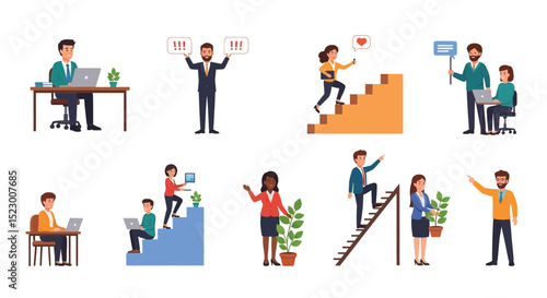 Business bankruptcy set, vector flat isolated illustration. Disappointed, scared, confused people because of being bankrupt, losing job. Business failure, financial crisis, economic crash.