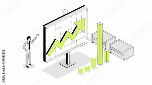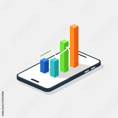 Business data graph chart on vector mobile screen. Finance or market analysis diagram on smartphone. Application for research and statistics collection. Isometric 3d phone isolated on white background