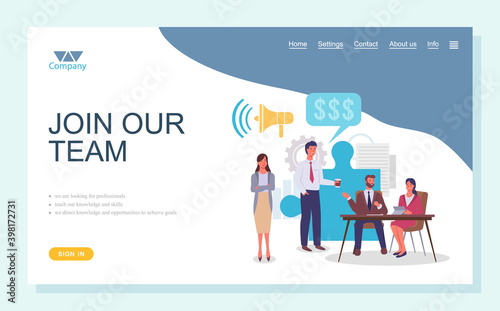Business hiring landing page website template. Vector isometric group of people and empty boss office chair standing in front of them. Human resources management and recruitment concept.